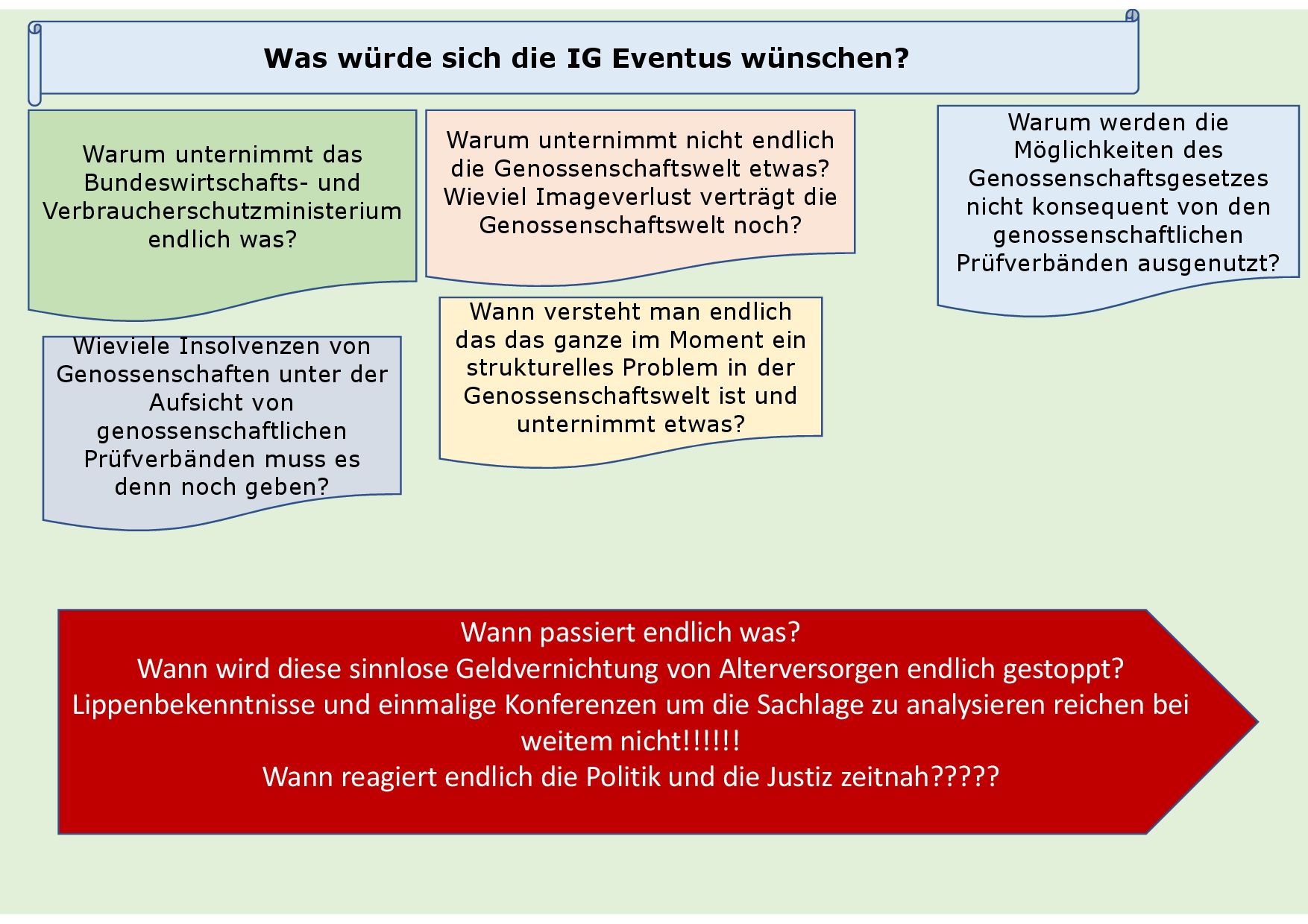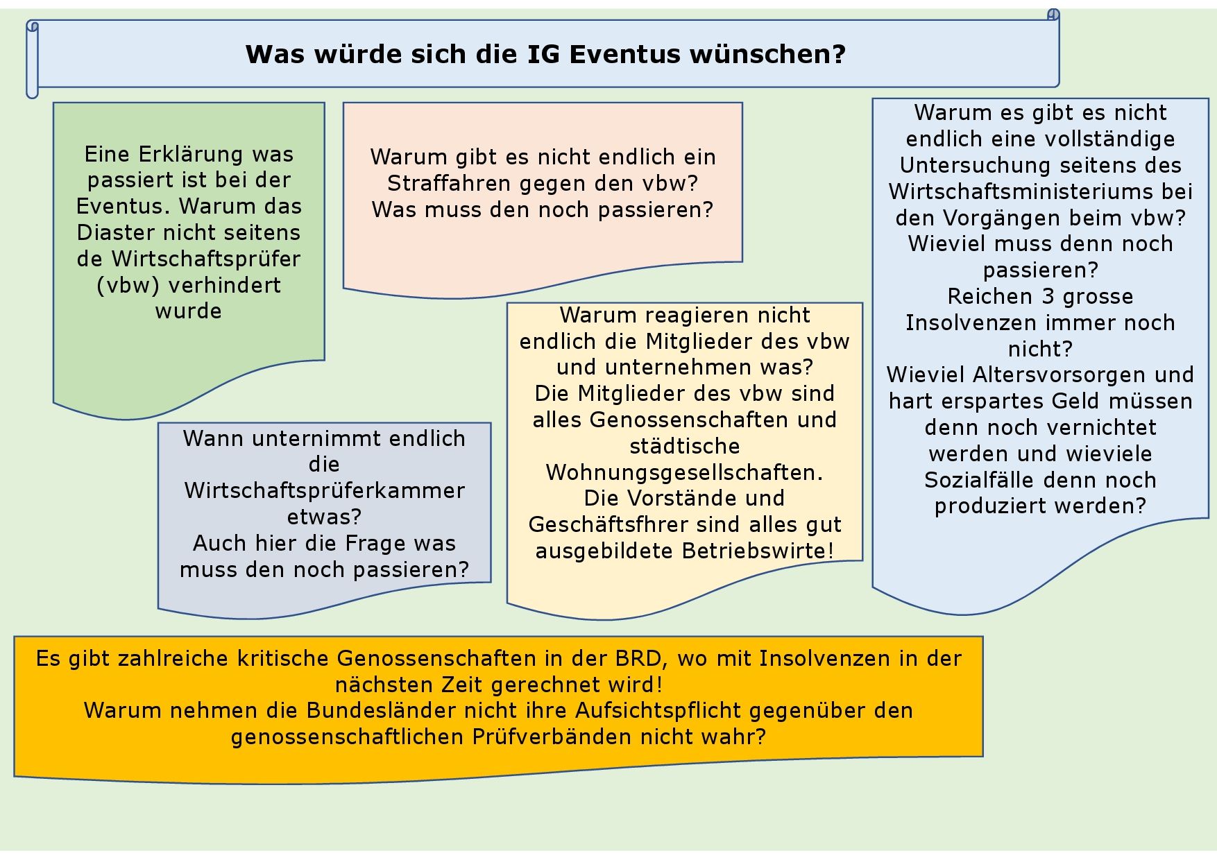 Wir bitten um Unterstützung bei dem Kampf um die Herausgabe des Sondergutachtens. Dies ist der einzige Weg, damit Existenzen von den Mitgliedern gesichert werden und der Fall Eventus keine Sozialfälle produziert. Alles näher hierzu hier klick
